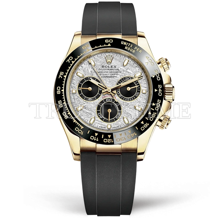 Часы Rolex из коллекции Daytona. Спортивные мужские часы Rolex Cosmograph Daytona 116518LN-0076 премиального качества (Артикул магазина: RX-2807) оснащены надежным автоматическим механизмом с автоподзаводом (работает от амплитуды движения руки) калибра 4130, в котором реализованы следующие функции: часовая, минутная и секундная стрелки, а так же хронограф. Круглый корпус часов цветы желтой золота, имеющий размер 40 мм и высоту 12.5 мм превосходно дополнит образ и украсит запястье своего обладателя. Для изготовления часов Rolex Cosmograph Daytona 116518LN-0076 предлагаемых в нашем интернет-магазине, применяются нержавеющая сталь 904L высокого качества (Швейцарский стандарт), а так же сапфировое стекло высокой прочности, благодаря чему обеспечивается максимальная защита от сколов и механических повреждений. Отличительной чертой данной модели является серебристый циферблат, часовые индексы которого обеспечивают часовые метки. Завершает образ каучуковый ремешок черного цвета с фирменной раскладывающейся застежкой Rolex. Водонепроницаемость данной модели составляет 100М (WR100) – в таких часах можно плавать и нырять без акваланга в морской и пресной воде, а также заниматься водными видами спорта.