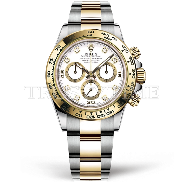 Часы Rolex из коллекции Daytona. Спортивные мужские часы Rolex Cosmograph Daytona 116523-0057 премиального качества (Артикул магазина: RX-2808) оснащены надежным автоматическим механизмом с автоподзаводом (работает от амплитуды движения руки) калибра 4130, в котором реализованы следующие функции: часовая, минутная и секундная стрелки, а так же хронограф. Круглый корпус часов комбинированного сталь с желтого золота цвета, имеющий размер 40 мм и высоту 12.5 мм превосходно дополнит образ и украсит запястье своего обладателя. Для изготовления часов Rolex Cosmograph Daytona 116523-0057 предлагаемых в нашем интернет-магазине, применяются нержавеющая сталь 904L высокого качества (Швейцарский стандарт), а так же сапфировое стекло высокой прочности, благодаря чему обеспечивается максимальная защита от сколов и механических повреждений. Отличительной чертой данной модели является белый циферблат, часовые индексы которого обеспечивают камни. Завершает образ браслет из нержавеющей стали комбинированного сталь с желтым золотом цвета с фирменной раскладывающейся застежкой Rolex. Водонепроницаемость данной модели составляет 100М (WR100) – в таких часах можно плавать и нырять без акваланга в морской и пресной воде, а также заниматься водными видами спорта.