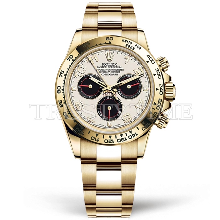 Часы Rolex из коллекции Daytona. Спортивные мужские часы Rolex Cosmograph Daytona 116528-0038 премиального качества (Артикул магазина: RX-2811) оснащены надежным автоматическим механизмом с автоподзаводом (работает от амплитуды движения руки) калибра 4130, в котором реализованы следующие функции: часовая, минутная и секундная стрелки, а так же хронограф. Круглый корпус часов цветы желтой золота, имеющий размер 40 мм и высоту 12.5 мм превосходно дополнит образ и украсит запястье своего обладателя. Для изготовления часов Rolex Cosmograph Daytona 116528-0038 предлагаемых в нашем интернет-магазине, применяются нержавеющая сталь 904L высокого качества (Швейцарский стандарт), а так же сапфировое стекло высокой прочности, благодаря чему обеспечивается максимальная защита от сколов и механических повреждений. Отличительной чертой данной модели является белый циферблат, часовые индексы которого обеспечивают арабские цифры. Завершает образ браслет из нержавеющей стали цвета желтого золота с фирменной раскладывающейся застежкой Rolex. Водонепроницаемость данной модели составляет 100М (WR100) – в таких часах можно плавать и нырять без акваланга в морской и пресной воде, а также заниматься водными видами спорта.