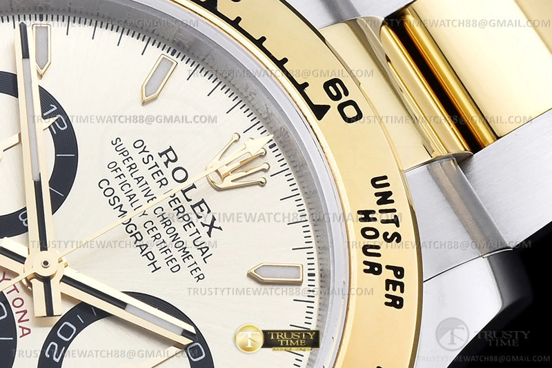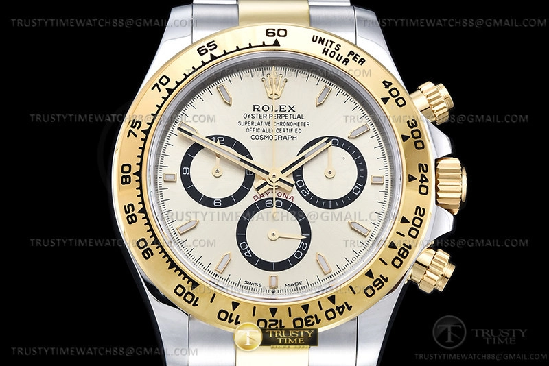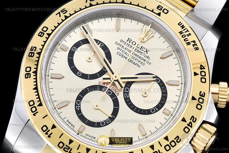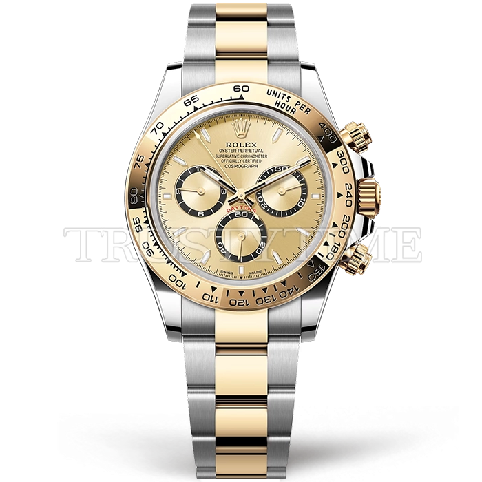 Часы Rolex из коллекции Daytona. Спортивные мужские часы Rolex Cosmograph Daytona 126503-0004 премиального качества (Артикул магазина: RX-3410) оснащены надежным автоматическим механизмом с автоподзаводом (работает от амплитуды движения руки) калибра 4131, в котором реализованы следующие функции: часовая, минутная и секундная стрелки, а так же хронограф. Круглый корпус часов комбинированного сталь с желтого золота цвета, имеющий размер 40 мм и высоту 12 мм превосходно дополнит образ и украсит запястье своего обладателя. Для изготовления часов Rolex Cosmograph Daytona 126503-0004 предлагаемых в нашем интернет-магазине, применяются нержавеющая сталь 904L высокого качества (Швейцарский стандарт), а так же сапфировое стекло высокой прочности, благодаря чему обеспечивается максимальная защита от сколов и механических повреждений. Отличительной чертой данной модели является золотой циферблат, часовые индексы которого обеспечивают часовые метки. Завершает образ браслет из нержавеющей стали комбинированного сталь с желтым золотом цвета с фирменной раскладывающейся застежкой Rolex. Водонепроницаемость данной модели составляет 100М (WR100) – в таких часах можно плавать и нырять без акваланга в морской и пресной воде, а также заниматься водными видами спорта.