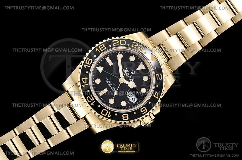 Часы Rolex из коллекции GMT Master II. Классические мужские часы Rolex GMT Master II 116718LN-0001 премиального качества (Артикул магазина: RX-2240) оснащены надежным автоматическим механизмом с автоподзаводом (работает от амплитуды движения руки) калибра 3186, в котором реализованы следующие функции: часовая, минутная и секундная стрелки, а так же дата, двойное время (GMT). Круглый корпус часов цветы желтой золота, имеющий размер 40 мм и высоту 12.1 мм превосходно дополнит образ и украсит запястье своего обладателя. Для изготовления часов Rolex GMT Master II 116718LN-0001 предлагаемых в нашем интернет-магазине, применяются нержавеющая сталь 904L высокого качества (Швейцарский стандарт), а так же сапфировое стекло высокой прочности, благодаря чему обеспечивается максимальная защита от сколов и механических повреждений. Отличительной чертой данной модели является черный циферблат, часовые индексы которого обеспечивают часовые метки. Завершает образ браслет из нержавеющей стали цвета желтого золота с фирменной раскладывающейся застежкой Rolex. Водонепроницаемость данной модели составляет 30М (WR30) – допускается минимальное воздействие с водой.