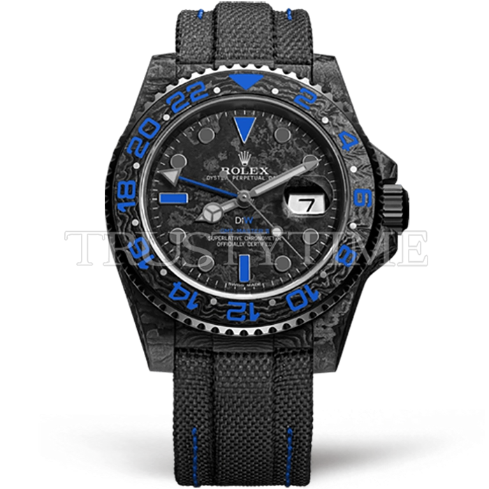 Часы Rolex из коллекции GMT Master II DIW. Спортивные мужские часы Rolex GMT Master II DIW Electro премиального качества (Артикул магазина: RX-2407) оснащены надежным автоматическим механизмом с автоподзаводом (работает от амплитуды движения руки) калибра 3186, в котором реализованы следующие функции: часовая, минутная и секундная стрелки, а так же дата, двойное время (GMT). Круглый корпус часов черного цвета, имеющий размер 40 мм и высоту 12 мм превосходно дополнит образ и украсит запястье своего обладателя. Для изготовления часов Rolex GMT Master II DIW Electro предлагаемых в нашем интернет-магазине, применяются кованый карбон высокого качества (Швейцарский стандарт), а так же сапфировое стекло высокой прочности, благодаря чему обеспечивается максимальная защита от сколов и механических повреждений. Отличительной чертой данной модели является черный циферблат, часовые индексы которого обеспечивают часовые метки. Завершает образ нейлоновый ремешок черного цвета на липучке Rolex. Водонепроницаемость данной модели составляет 30М (WR30) – допускается минимальное воздействие с водой.