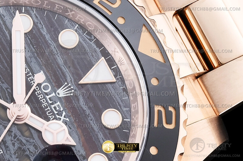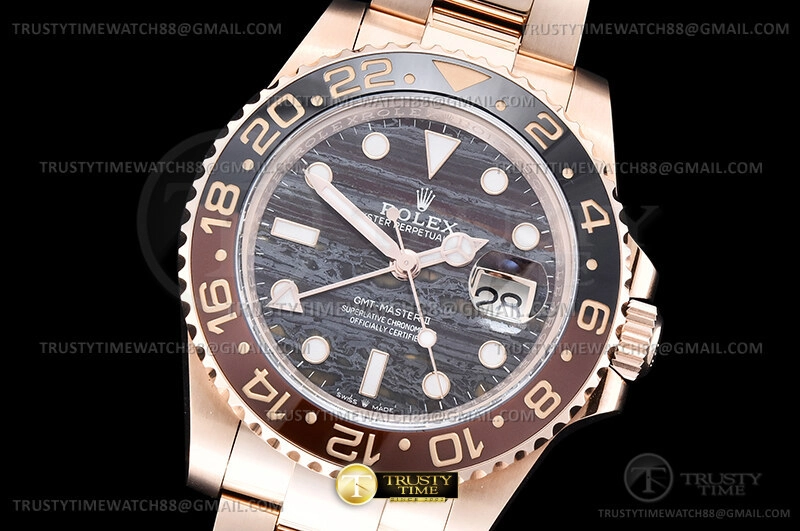 Часы Rolex из коллекции GMT Master II. Классические мужские часы Rolex GMT Master II 40mm 126715CHNR-0002 премиального качества (Артикул магазина: RX-3535) оснащены надежным автоматическим механизмом с автоподзаводом (работает от амплитуды движения руки) калибра 3285, в котором реализованы следующие функции: часовая, минутная и секундная стрелки, а так же дата, двойное время (GMT). Круглый корпус часов розового цвета, имеющий размер 40 мм и высоту 12 мм превосходно дополнит образ и украсит запястье своего обладателя. Для изготовления часов Rolex GMT Master II 40mm 126715CHNR-0002 предлагаемых в нашем интернет-магазине, применяются нержавеющая сталь 904L высокого качества (Швейцарский стандарт), а так же сапфировое стекло высокой прочности, благодаря чему обеспечивается максимальная защита от сколов и механических повреждений. Отличительной чертой данной модели является коричневый циферблат, часовые индексы которого обеспечивают часовые метки. Завершает образ браслет из нержавеющей стали цвета розового золота с фирменной раскладывающейся застежкой Rolex. Водонепроницаемость данной модели составляет 30М (WR30) – допускается минимальное воздействие с водой.