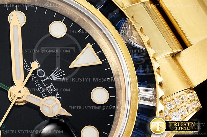 Часы Rolex из коллекции GMT Master II. Классические мужские, женские часы Rolex GMT Master II 116758SARU премиального качества (Артикул магазина: RX-1383) оснащены надежным автоматическим механизмом с автоподзаводом (работает от амплитуды движения руки) калибра 3186, в котором реализованы следующие функции: часовая, минутная и секундная стрелки, а так же дата, двойное время (GMT). Круглый корпус часов цветы желтой золота, имеющий размер 40 мм и высоту 13 мм превосходно дополнит образ и украсит запястье своего обладателя. Для изготовления часов Rolex GMT Master II 116758SARU предлагаемых в нашем интернет-магазине, применяются нержавеющая сталь 316F высокого качества (Швейцарский стандарт), а так же сапфировое стекло высокой прочности, благодаря чему обеспечивается максимальная защита от сколов и механических повреждений. Отличительной чертой данной модели является черный циферблат, часовые индексы которого обеспечивают часовые метки. Завершает образ браслет из нержавеющей стали цвета желтого золота с фирменной раскладывающейся застежкой Rolex. Водонепроницаемость данной модели составляет 30М (WR30) – допускается минимальное воздействие с водой.