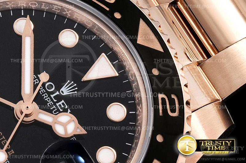 Часы Rolex из коллекции GMT Master II. Классические мужские часы Rolex GMT Master II 126715CHNR-0001 премиального качества (Артикул магазина: RX-1350) оснащены надежным автоматическим механизмом с автоподзаводом (работает от амплитуды движения руки) калибра 3186, в котором реализованы следующие функции: часовая, минутная и секундная стрелки, а так же дата, двойное время (GMT). Круглый корпус часов розового цвета, имеющий размер 40 мм и высоту 12.5 мм превосходно дополнит образ и украсит запястье своего обладателя. Для изготовления часов Rolex GMT Master II 126715CHNR-0001 предлагаемых в нашем интернет-магазине, применяются нержавеющая сталь 316F высокого качества (Швейцарский стандарт), а так же сапфировое стекло высокой прочности, благодаря чему обеспечивается максимальная защита от сколов и механических повреждений. Отличительной чертой данной модели является черный циферблат, часовые индексы которого обеспечивают часовые метки. Завершает образ браслет из нержавеющей стали цвета розового золота с фирменной раскладывающейся застежкой Rolex. Водонепроницаемость данной модели составляет 30М (WR30) – допускается минимальное воздействие с водой.