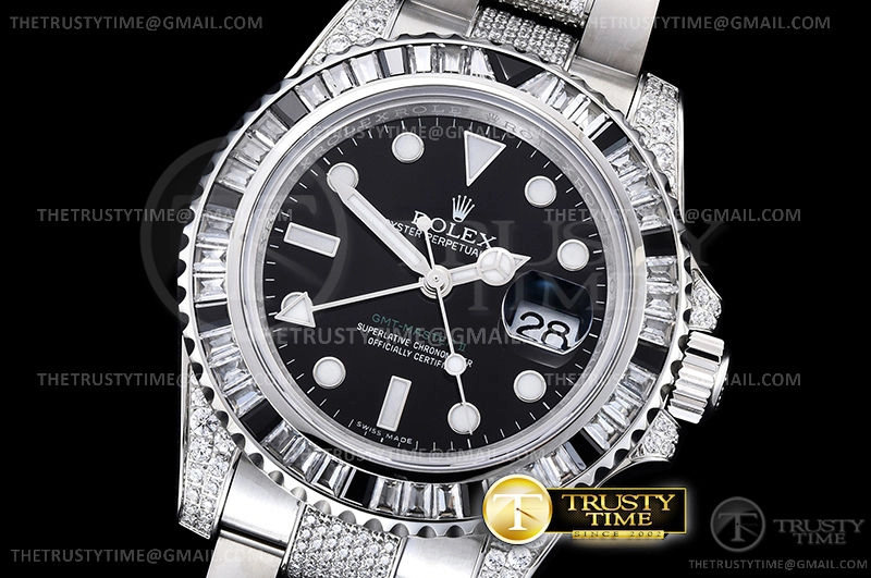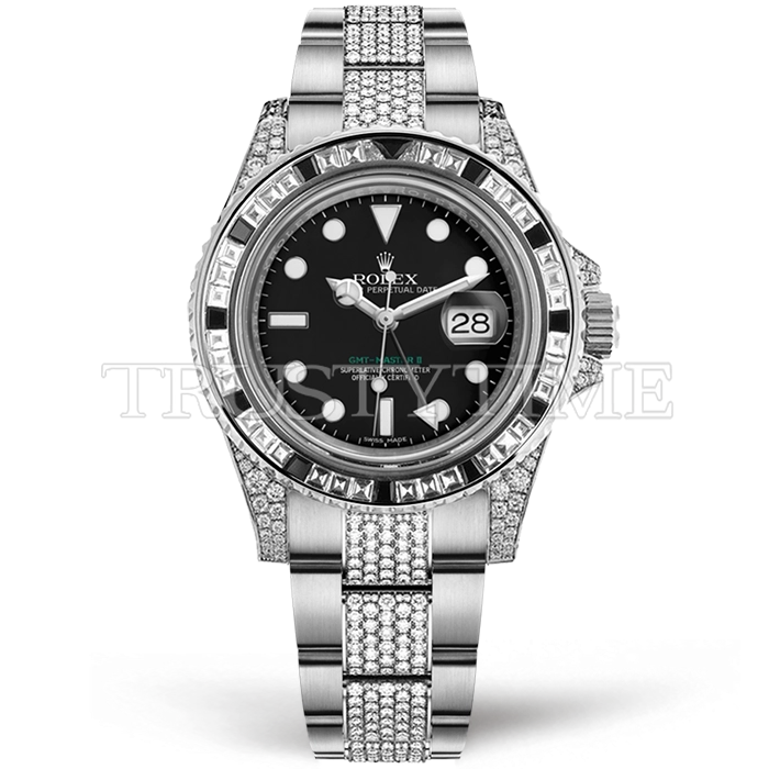 Часы Rolex из коллекции GMT Master II. Классические мужские, женские часы Rolex GMT Master II 116759SANR премиального качества (Артикул магазина: RX-1657) оснащены надежным автоматическим механизмом с автоподзаводом (работает от амплитуды движения руки) калибра 3186, в котором реализованы следующие функции: часовая, минутная и секундная стрелки, а так же дата, двойное время (GMT). Круглый корпус часов стального цвета, имеющий размер 40 мм и высоту 12 мм превосходно дополнит образ и украсит запястье своего обладателя. Для изготовления часов Rolex GMT Master II 116759SANR предлагаемых в нашем интернет-магазине, применяются нержавеющая сталь 904L высокого качества (Швейцарский стандарт), а так же сапфировое стекло высокой прочности, благодаря чему обеспечивается максимальная защита от сколов и механических повреждений. Отличительной чертой данной модели является черный циферблат, часовые индексы которого обеспечивают часовые метки. Завершает образ браслет из нержавеющей стали стального цвета с фирменной раскладывающейся застежкой Rolex. Водонепроницаемость данной модели составляет 30М (WR30) – допускается минимальное воздействие с водой.