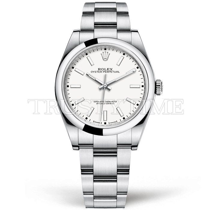 Часы Rolex из коллекции Oyster Perpetual. Классические мужские часы Rolex Oyster Perpetual 39mm 114300-0004 премиального качества (Артикул магазина: RX-1427) оснащены надежным автоматическим механизмом с автоподзаводом (работает от амплитуды движения руки) калибра 3132, в котором реализованы следующие функции: часовая, минутная и секундная стрелки, а так же максимально простой функционал без усложнений. Круглый корпус часов стального цвета, имеющий размер 39 мм и высоту 11 мм превосходно дополнит образ и украсит запястье своего обладателя. Для изготовления часов Rolex Oyster Perpetual 39mm 114300-0004 предлагаемых в нашем интернет-магазине, применяются нержавеющая сталь 904L высокого качества (Швейцарский стандарт), а так же сапфировое стекло высокой прочности, благодаря чему обеспечивается максимальная защита от сколов и механических повреждений. Отличительной чертой данной модели является белый циферблат, часовые индексы которого обеспечивают часовые метки. Завершает образ браслет из нержавеющей стали стального цвета с фирменной раскладывающейся застежкой Rolex. Водонепроницаемость данной модели составляет 30М (WR30) – допускается минимальное воздействие с водой.