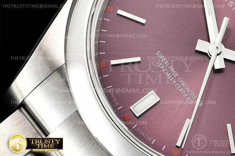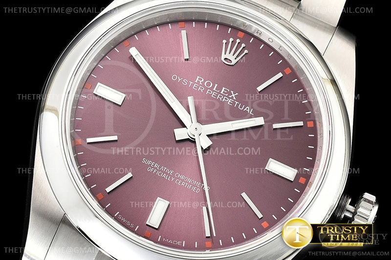 Часы Rolex из коллекции Oyster Perpetual. Классические мужские часы Rolex Oyster Perpetual 39mm 114300-0002 премиального качества (Артикул магазина: RX-1423) оснащены надежным автоматическим механизмом с автоподзаводом (работает от амплитуды движения руки) калибра 3132, в котором реализованы следующие функции: часовая, минутная и секундная стрелки, а так же максимально простой функционал без усложнений. Круглый корпус часов стального цвета, имеющий размер 39 мм и высоту 11 мм превосходно дополнит образ и украсит запястье своего обладателя. Для изготовления часов Rolex Oyster Perpetual 39mm 114300-0002 предлагаемых в нашем интернет-магазине, применяются нержавеющая сталь 904L высокого качества (Швейцарский стандарт), а так же сапфировое стекло высокой прочности, благодаря чему обеспечивается максимальная защита от сколов и механических повреждений. Отличительной чертой данной модели является фиолетовый циферблат, часовые индексы которого обеспечивают часовые метки. Завершает образ браслет из нержавеющей стали стального цвета с фирменной раскладывающейся застежкой Rolex. Водонепроницаемость данной модели составляет 30М (WR30) – допускается минимальное воздействие с водой.