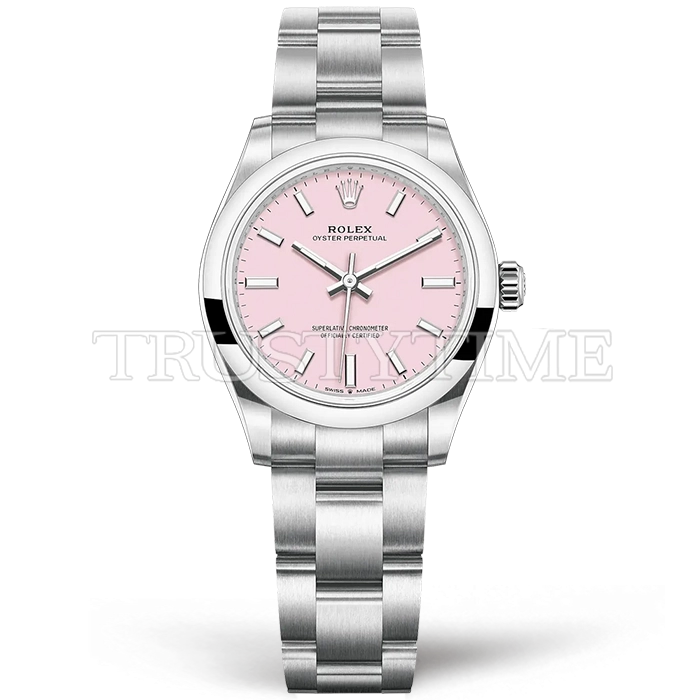 Часы Rolex из коллекции Oyster Perpetual. Классические женские часы Rolex Oyster Perpetual 31mm 277200-0004 премиального качества (Артикул магазина: RX-1802) оснащены надежным автоматическим механизмом с автоподзаводом (работает от амплитуды движения руки) калибра MY6T15, в котором реализованы следующие функции: часовая, минутная и секундная стрелки, а так же максимально простой функционал без усложнений. Круглый корпус часов стального цвета, имеющий размер 31 мм и высоту 11 мм превосходно дополнит образ и украсит запястье своего обладателя. Для изготовления часов Rolex Oyster Perpetual 31mm 277200-0004 предлагаемых в нашем интернет-магазине, применяются нержавеющая сталь 316F высокого качества (Швейцарский стандарт), а так же сапфировое стекло высокой прочности, благодаря чему обеспечивается максимальная защита от сколов и механических повреждений. Отличительной чертой данной модели является розовый циферблат, часовые индексы которого обеспечивают часовые метки. Завершает образ браслет из нержавеющей стали стального цвета с фирменной раскладывающейся застежкой Rolex. Водонепроницаемость данной модели составляет 30М (WR30) – допускается минимальное воздействие с водой.