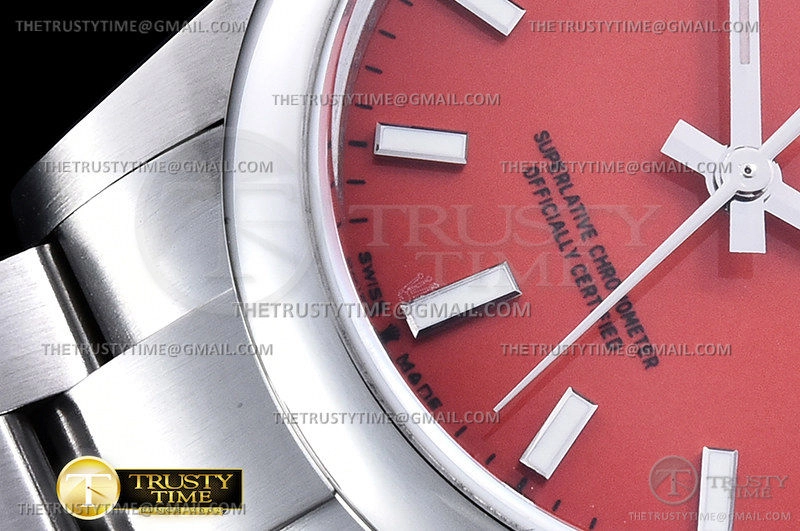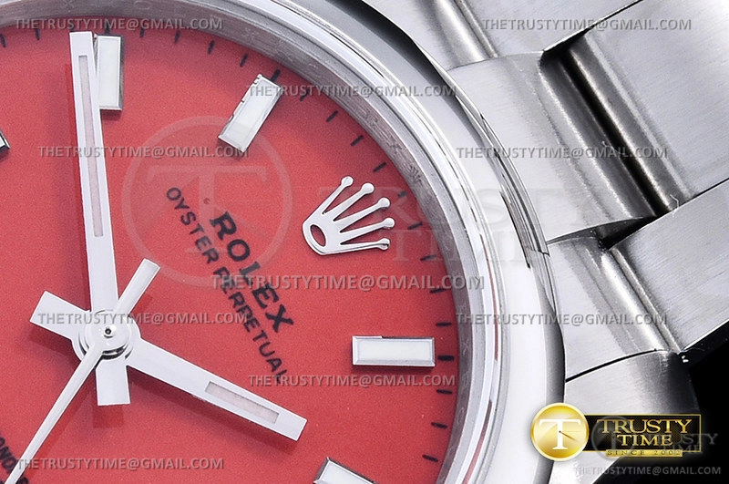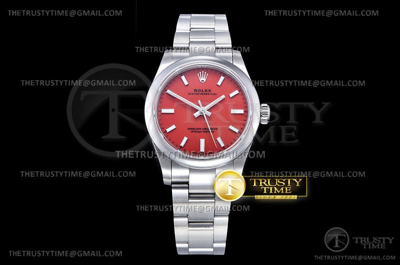 Часы Rolex из коллекции Oyster Perpetual. Классические женские часы Rolex Oyster Perpetual 31mm 277200-0008 премиального качества (Артикул магазина: RX-1805) оснащены надежным автоматическим механизмом с автоподзаводом (работает от амплитуды движения руки) калибра MY6T15, в котором реализованы следующие функции: часовая, минутная и секундная стрелки, а так же максимально простой функционал без усложнений. Круглый корпус часов стального цвета, имеющий размер 31 мм и высоту 11 мм превосходно дополнит образ и украсит запястье своего обладателя. Для изготовления часов Rolex Oyster Perpetual 31mm 277200-0008 предлагаемых в нашем интернет-магазине, применяются нержавеющая сталь 316F высокого качества (Швейцарский стандарт), а так же сапфировое стекло высокой прочности, благодаря чему обеспечивается максимальная защита от сколов и механических повреждений. Отличительной чертой данной модели является красный циферблат, часовые индексы которого обеспечивают часовые метки. Завершает образ браслет из нержавеющей стали стального цвета с фирменной раскладывающейся застежкой Rolex. Водонепроницаемость данной модели составляет 30М (WR30) – допускается минимальное воздействие с водой.