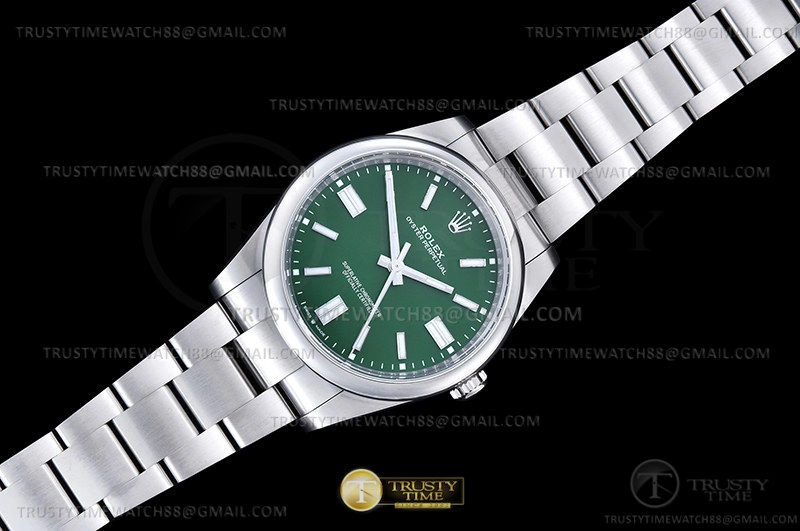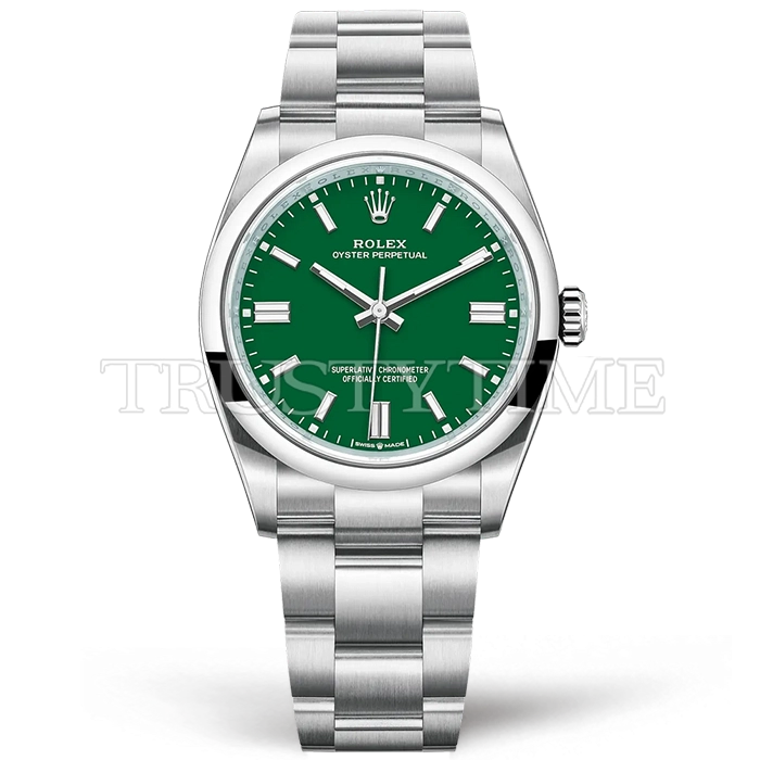 Часы Rolex из коллекции Oyster Perpetual. Классические женские часы Rolex Oyster Perpetual 36mm 126000-0005 премиального качества (Артикул магазина: RX-1863) оснащены надежным автоматическим механизмом с автоподзаводом (работает от амплитуды движения руки) калибра 3230, в котором реализованы следующие функции: часовая, минутная и секундная стрелки, а так же максимально простой функционал без усложнений. Круглый корпус часов стального цвета, имеющий размер 36 мм и высоту 12 мм превосходно дополнит образ и украсит запястье своего обладателя. Для изготовления часов Rolex Oyster Perpetual 36mm 126000-0005 предлагаемых в нашем интернет-магазине, применяются нержавеющая сталь 904L высокого качества (Швейцарский стандарт), а так же сапфировое стекло высокой прочности, благодаря чему обеспечивается максимальная защита от сколов и механических повреждений. Отличительной чертой данной модели является зеленый циферблат, часовые индексы которого обеспечивают часовые метки. Завершает образ браслет из нержавеющей стали стального цвета с фирменной раскладывающейся застежкой Rolex. Водонепроницаемость данной модели составляет 30М (WR30) – допускается минимальное воздействие с водой.