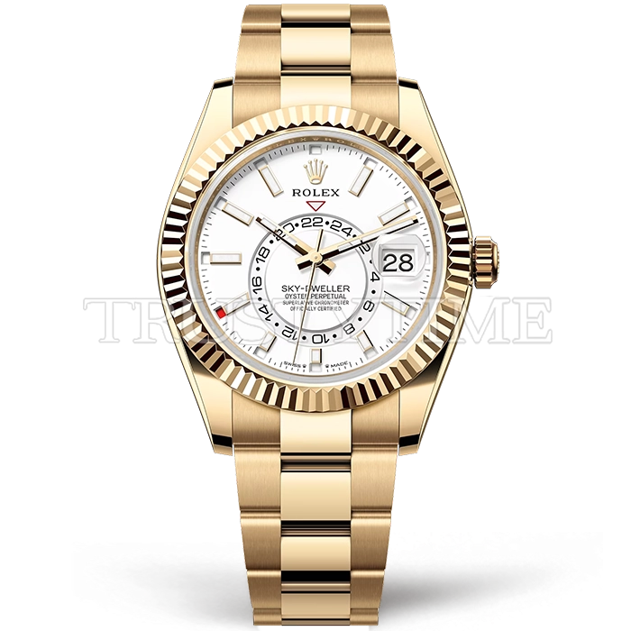 Часы Rolex из коллекции Sky-Dweller. Классические мужские часы Rolex Sky-Dweller 42mm 326938-0003 премиального качества (Артикул магазина: RX-2833) оснащены надежным автоматическим механизмом с автоподзаводом (работает от амплитуды движения руки) калибра 9002, в котором реализованы следующие функции: часовая, минутная и секундная стрелки, а так же дата, двойное время (GMT), месяц. Круглый корпус часов цветы желтой золота, имеющий размер 42 мм и высоту 15 мм превосходно дополнит образ и украсит запястье своего обладателя. Для изготовления часов Rolex Sky-Dweller 42mm 326938-0003 предлагаемых в нашем интернет-магазине, применяются нержавеющая сталь 316F высокого качества (Швейцарский стандарт), а так же сапфировое стекло высокой прочности, благодаря чему обеспечивается максимальная защита от сколов и механических повреждений. Отличительной чертой данной модели является белый циферблат, часовые индексы которого обеспечивают часовые метки. Завершает образ браслет из нержавеющей стали цвета желтого золота с фирменной раскладывающейся застежкой Rolex. Водонепроницаемость данной модели составляет 30М (WR30) – допускается минимальное воздействие с водой.