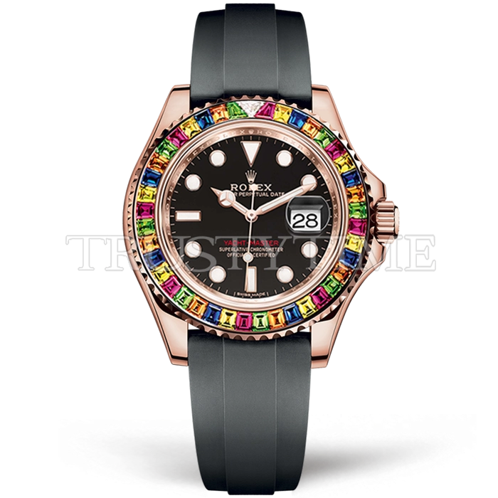 Часы Rolex из коллекции Yacht-Master. Классические мужские часы Rolex Yacht-Master 40mm 116695SATS премиального качества (Артикул магазина: RX-2926) оснащены надежным автоматическим механизмом с автоподзаводом (работает от амплитуды движения руки) калибра 3235, в котором реализованы следующие функции: часовая, минутная и секундная стрелки, а так же дата. Круглый корпус часов розового цвета, имеющий размер 40 мм и высоту 12.5 мм превосходно дополнит образ и украсит запястье своего обладателя. Для изготовления часов Rolex Yacht-Master 40mm 116695SATS предлагаемых в нашем интернет-магазине, применяются нержавеющая сталь 316F высокого качества (Швейцарский стандарт), а так же сапфировое стекло высокой прочности, благодаря чему обеспечивается максимальная защита от сколов и механических повреждений. Отличительной чертой данной модели является черный циферблат, часовые индексы которого обеспечивают часовые метки. Завершает образ каучуковый ремешок черного цвета с фирменной раскладывающейся застежкой Rolex. Водонепроницаемость данной модели составляет 30М (WR30) – допускается минимальное воздействие с водой.