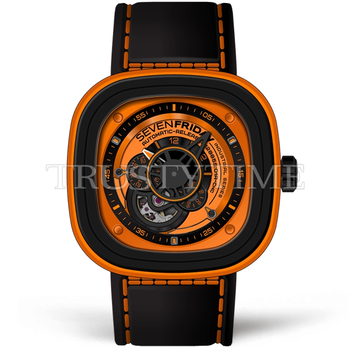 Часы SevenFriday из коллекции P Series. Спортивные мужские часы SevenFriday P1-3 премиального качества (Артикул магазина: SF-0274) оснащены надежным автоматическим механизмом с автоподзаводом (работает от амплитуды движения руки) калибра MY9015, в котором реализованы следующие функции: часовая, минутная и секундная стрелки, а так же максимально простой функционал без усложнений. Квадратный корпус часов черного цвета, имеющий размер 47 мм и высоту 12 мм превосходно дополнит образ и украсит запястье своего обладателя. Для изготовления часов SevenFriday P1-3 предлагаемых в нашем интернет-магазине, применяются нержавеющая сталь 316L высокого качества (Швейцарский стандарт), а так же сапфировое стекло высокой прочности, благодаря чему обеспечивается максимальная защита от сколов и механических повреждений. Отличительной чертой данной модели является оранжевый циферблат, часовые индексы которого обеспечивают часовые метки. Завершает образ кожаный ремешок черного цвета с фирменной классической застежкой SevenFriday. Водонепроницаемость данной модели составляет 30М (WR30) – допускается минимальное воздействие с водой.