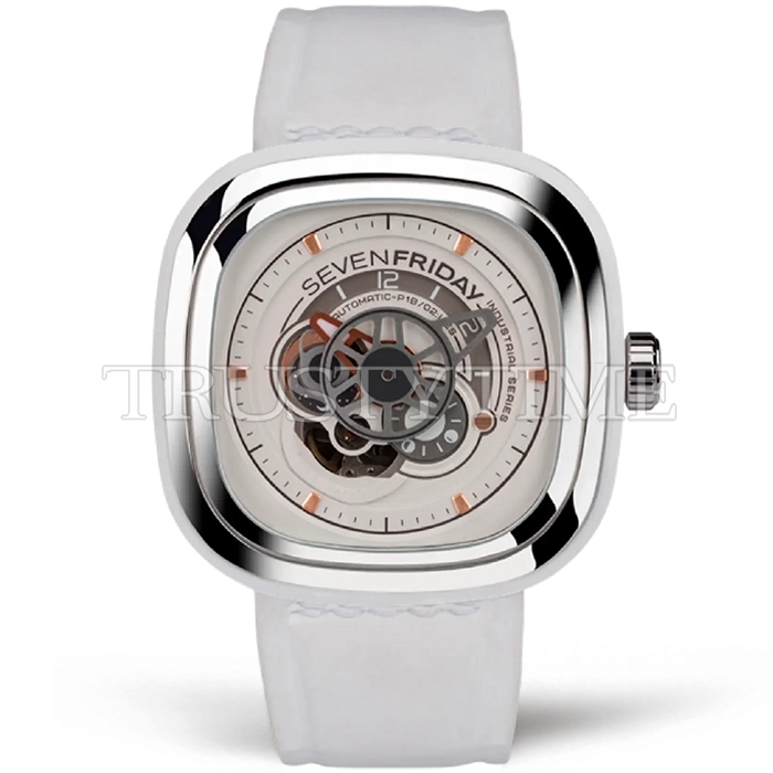 Часы SevenFriday из коллекции P Series. Спортивные мужские часы SevenFriday P1B/02 "BRIGHT" премиального качества (Артикул магазина: SF-0295) оснащены надежным автоматическим механизмом с автоподзаводом (работает от амплитуды движения руки) калибра MY9015, в котором реализованы следующие функции: часовая, минутная и секундная стрелки, а так же максимально простой функционал без усложнений. Квадратный корпус часов стального цвета, имеющий размер 47 мм и высоту 12 мм превосходно дополнит образ и украсит запястье своего обладателя. Для изготовления часов SevenFriday P1B/02 "BRIGHT" предлагаемых в нашем интернет-магазине, применяются нержавеющая сталь 316L высокого качества (Швейцарский стандарт), а так же сапфировое стекло высокой прочности, благодаря чему обеспечивается максимальная защита от сколов и механических повреждений. Отличительной чертой данной модели является белый циферблат, часовые индексы которого обеспечивают часовые метки. Завершает образ кожаный ремешок белого цвета с фирменной классической застежкой SevenFriday. Водонепроницаемость данной модели составляет 30М (WR30) – допускается минимальное воздействие с водой.