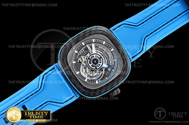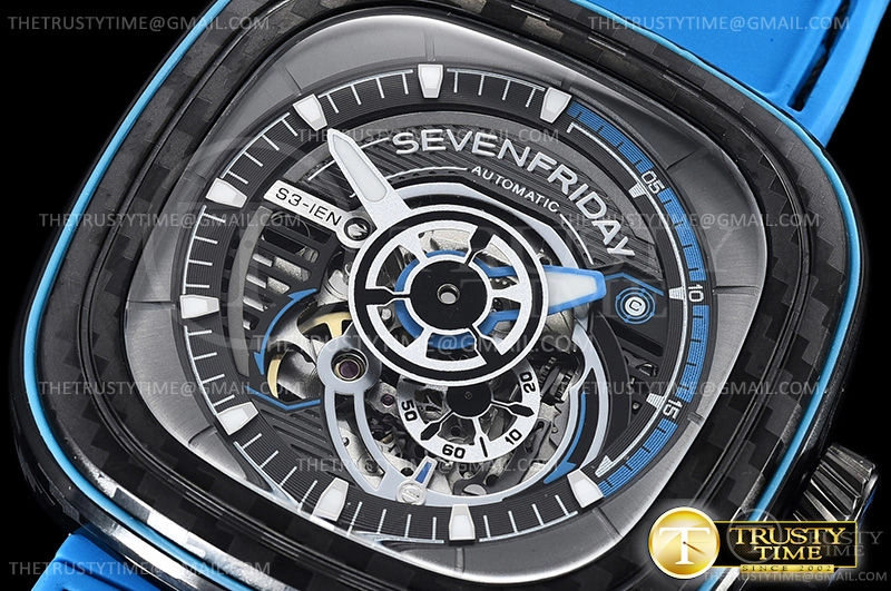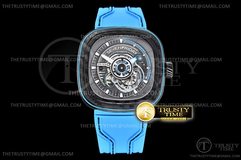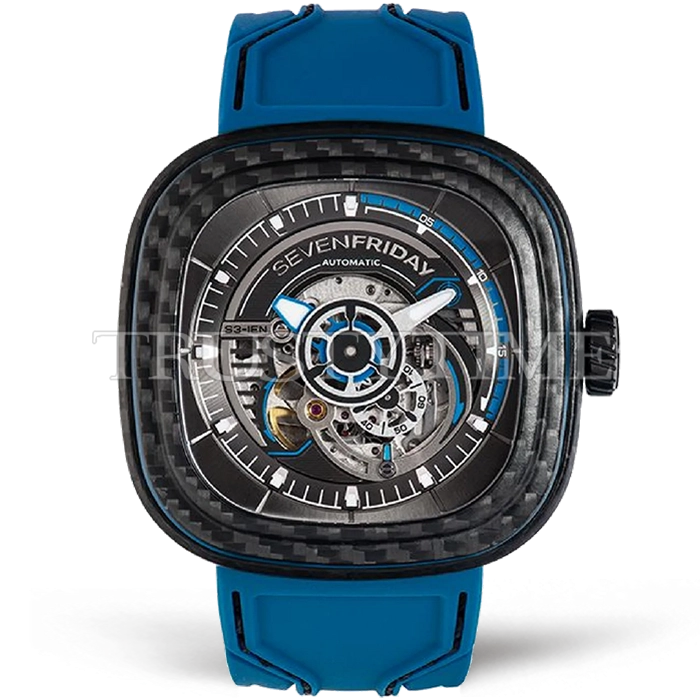 Часы SevenFriday из коллекции S Series. Классические мужские часы SevenFriday S3/02 "CARBON EDITION" премиального качества (Артикул магазина: SF-0290) оснащены надежным автоматическим механизмом с автоподзаводом (работает от амплитуды движения руки) калибра MY9015, в котором реализованы следующие функции: часовая, минутная и секундная стрелки, а так же максимально простой функционал без усложнений. Квадратный корпус часов черного цвета, имеющий размер 47 мм и высоту 15 мм превосходно дополнит образ и украсит запястье своего обладателя. Для изготовления часов SevenFriday S3/02 "CARBON EDITION" предлагаемых в нашем интернет-магазине, применяются нержавеющая сталь 316L высокого качества (Швейцарский стандарт), а так же сапфировое стекло высокой прочности, благодаря чему обеспечивается максимальная защита от сколов и механических повреждений. Отличительной чертой данной модели является черный циферблат, часовые индексы которого обеспечивают часовые метки. Завершает образ каучуковый ремешок синего цвета с фирменной классической застежкой SevenFriday. Водонепроницаемость данной модели составляет 30М (WR30) – допускается минимальное воздействие с водой.