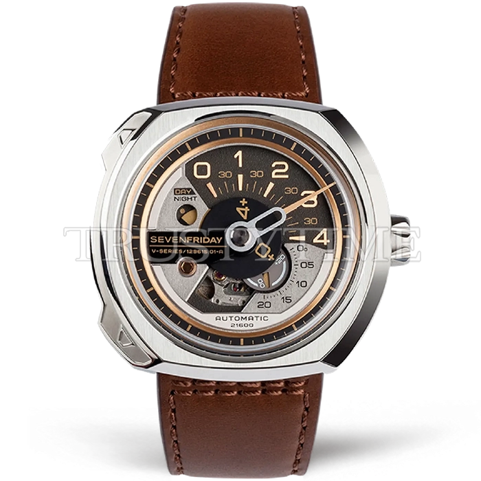 Часы SevenFriday из коллекции V Series. Спортивные мужские часы SevenFriday V2/01 премиального качества (Артикул магазина: SF-0265) оснащены надежным автоматическим механизмом с автоподзаводом (работает от амплитуды движения руки) калибра MY9015, в котором реализованы следующие функции: часовая, минутная и секундная стрелки, а так же максимально простой функционал без усложнений. Круглый корпус часов стального цвета, имеющий размер 47 мм и высоту 12 мм превосходно дополнит образ и украсит запястье своего обладателя. Для изготовления часов SevenFriday V2/01 предлагаемых в нашем интернет-магазине, применяются нержавеющая сталь 316L высокого качества (Швейцарский стандарт), а так же сапфировое стекло высокой прочности, благодаря чему обеспечивается максимальная защита от сколов и механических повреждений. Отличительной чертой данной модели является золотой циферблат, часовые индексы которого обеспечивают часовые метки. Завершает образ кожаный ремешок коричневого цвета с фирменной классической застежкой SevenFriday. Водонепроницаемость данной модели составляет 30М (WR30) – допускается минимальное воздействие с водой.