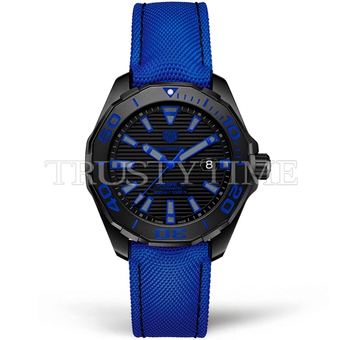 Часы Tag Heuer из коллекции Aquaracer Calibre 5. Классические мужские часы Tag Heuer Aquaracer Calibre 5 43mm WAY208B.FC6382 премиального качества (Артикул магазина: TG-0345) оснащены надежным автоматическим механизмом с автоподзаводом (работает от амплитуды движения руки) калибра ETA2824-2, в котором реализованы следующие функции: часовая, минутная и секундная стрелки, а так же дата. Круглый корпус часов черного цвета, имеющий размер 43 мм и высоту 13 мм превосходно дополнит образ и украсит запястье своего обладателя. Для изготовления часов Tag Heuer Aquaracer Calibre 5 43mm WAY208B.FC6382 предлагаемых в нашем интернет-магазине, применяются нержавеющая сталь 316L высокого качества (Швейцарский стандарт), а так же сапфировое стекло высокой прочности, благодаря чему обеспечивается максимальная защита от сколов и механических повреждений. Отличительной чертой данной модели является черный циферблат, часовые индексы которого обеспечивают часовые метки. Завершает образ нейлоновый ремешок синего цвета с фирменной раскладывающейся застежкой Tag Heuer. Водонепроницаемость данной модели составляет 30М (WR30) – допускается минимальное воздействие с водой.