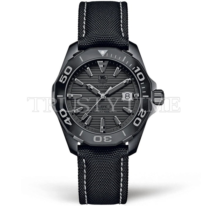 Часы Tag Heuer из коллекции Aquaracer Calibre 5. Классические мужские часы Tag Heuer Aquaracer Calibre 5 41mm WAY218B.FC6364 премиального качества (Артикул магазина: TG-0591) оснащены надежным автоматическим механизмом с автоподзаводом (работает от амплитуды движения руки) калибра ETA2824-2, в котором реализованы следующие функции: часовая, минутная и секундная стрелки, а так же дата. Круглый корпус часов черного цвета, имеющий размер 41 мм и высоту 12 мм превосходно дополнит образ и украсит запястье своего обладателя. Для изготовления часов Tag Heuer Aquaracer Calibre 5 41mm WAY218B.FC6364 предлагаемых в нашем интернет-магазине, применяются нержавеющая сталь высокого качества (Швейцарский стандарт), а так же сапфировое стекло высокой прочности, благодаря чему обеспечивается максимальная защита от сколов и механических повреждений. Отличительной чертой данной модели является черный циферблат, часовые индексы которого обеспечивают часовые метки. Завершает образ нейлоновый ремешок черного цвета с фирменной раскладывающейся застежкой Tag Heuer. Водонепроницаемость данной модели составляет 30М (WR30) – допускается минимальное воздействие с водой.