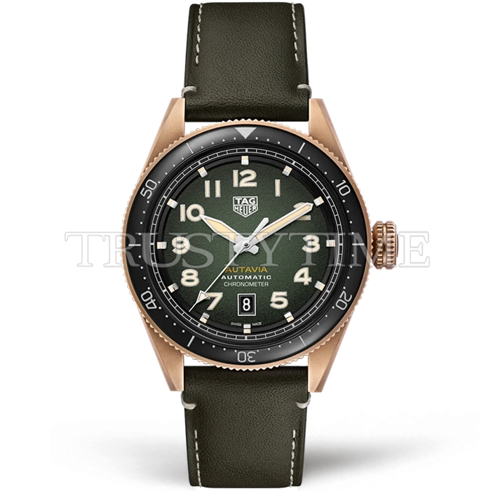 Часы Tag Heuer из коллекции Autavia. Спортивные мужские часы Tag Heuer Autavia Isograph Calibre 5 42mm WBE5190.FC8268 премиального качества (Артикул магазина: TG-0603) оснащены надежным автоматическим механизмом с автоподзаводом (работает от амплитуды движения руки) калибра Sellita SW200, в котором реализованы следующие функции: часовая, минутная и секундная стрелки, а так же дата. Круглый корпус часов розового цвета, имеющий размер 42 мм и высоту 13.5 мм превосходно дополнит образ и украсит запястье своего обладателя. Для изготовления часов Tag Heuer Autavia Isograph Calibre 5 42mm WBE5190.FC8268 предлагаемых в нашем интернет-магазине, применяются нержавеющая сталь 316L высокого качества (Швейцарский стандарт), а так же сапфировое стекло высокой прочности, благодаря чему обеспечивается максимальная защита от сколов и механических повреждений. Отличительной чертой данной модели является зеленый циферблат, часовые индексы которого обеспечивают арабские цифры. Завершает образ кожаный ремешок зеленого цвета с фирменной классической застежкой Tag Heuer. Водонепроницаемость данной модели составляет 30М (WR30) – допускается минимальное воздействие с водой.