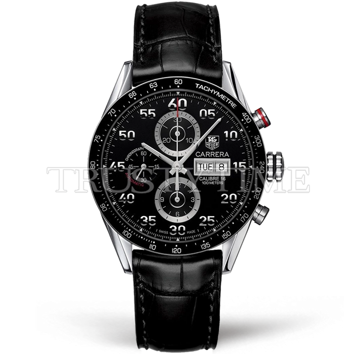 Часы Tag Heuer из коллекции Carrera Calibre 16. Спортивные мужские часы Tag Heuer Carrera Calibre 16 Day Date 43mm CV2A10.FC6235 премиального качества (Артикул магазина: TG-0560) оснащены надежным автоматическим механизмом с автоподзаводом (работает от амплитуды движения руки) калибра 1887, в котором реализованы следующие функции: часовая, минутная и секундная стрелки, а так же дата, день недели, хронограф. Круглый корпус часов стального цвета, имеющий размер 43 мм и высоту 17 мм превосходно дополнит образ и украсит запястье своего обладателя. Для изготовления часов Tag Heuer Carrera Calibre 16 Day Date 43mm CV2A10.FC6235 предлагаемых в нашем интернет-магазине, применяются нержавеющая сталь 316L высокого качества (Швейцарский стандарт), а так же сапфировое стекло высокой прочности, благодаря чему обеспечивается максимальная защита от сколов и механических повреждений. Отличительной чертой данной модели является черный циферблат, часовые индексы которого обеспечивают арабские цифры. Завершает образ кожаный ремешок черного цвета с фирменной раскладывающейся застежкой Tag Heuer. Водонепроницаемость данной модели составляет 30М (WR30) – допускается минимальное воздействие с водой.