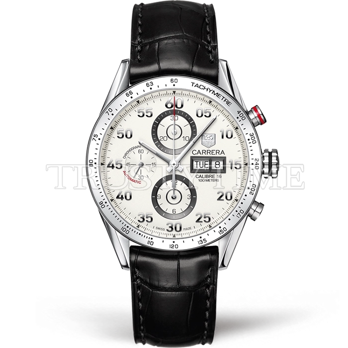 Часы Tag Heuer из коллекции Carrera Calibre 16. Спортивные мужские часы Tag Heuer Carrera Calibre 16 Day Date 43mm CV2A11.FC6235 премиального качества (Артикул магазина: TG-0606) оснащены надежным автоматическим механизмом с автоподзаводом (работает от амплитуды движения руки) калибра Valjoux-7750, в котором реализованы следующие функции: часовая, минутная и секундная стрелки, а так же дата, день недели, хронограф. Круглый корпус часов стального цвета, имеющий размер 43 мм и высоту 16 мм превосходно дополнит образ и украсит запястье своего обладателя. Для изготовления часов Tag Heuer Carrera Calibre 16 Day Date 43mm CV2A11.FC6235 предлагаемых в нашем интернет-магазине, применяются нержавеющая сталь 316L высокого качества (Швейцарский стандарт), а так же сапфировое стекло высокой прочности, благодаря чему обеспечивается максимальная защита от сколов и механических повреждений. Отличительной чертой данной модели является белый циферблат, часовые индексы которого обеспечивают часовые метки. Завершает образ кожаный ремешок черного цвета с фирменной раскладывающейся застежкой Tag Heuer. Водонепроницаемость данной модели составляет 30М (WR30) – допускается минимальное воздействие с водой.