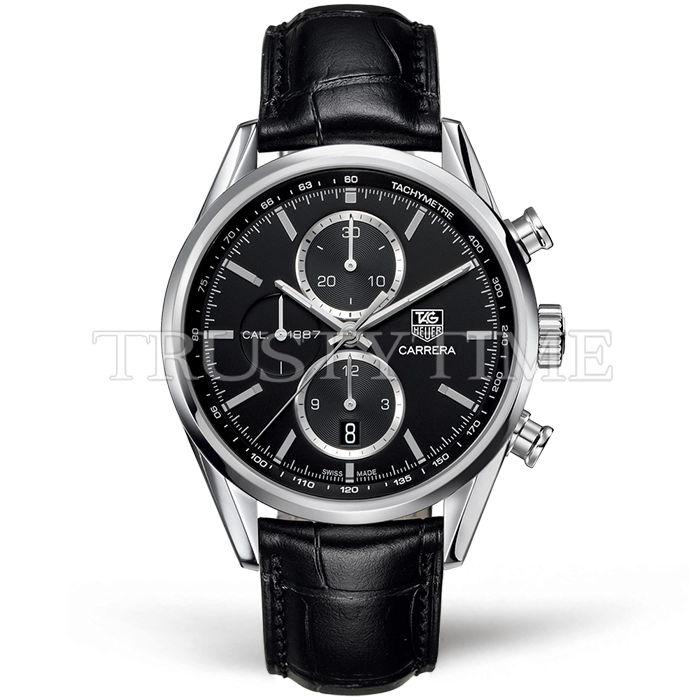 Часы Tag Heuer из коллекции Carrera Calibre 1887. Спортивные мужские часы Tag Heuer Carrera Calibre 1887 41mm CAR2110.FC6266 премиального качества (Артикул магазина: TG-0609) оснащены надежным автоматическим механизмом с автоподзаводом (работает от амплитуды движения руки) калибра Valjoux-7750, в котором реализованы следующие функции: часовая, минутная и секундная стрелки, а так же хронограф, дата. Круглый корпус часов стального цвета, имеющий размер 41 мм и высоту 16 мм превосходно дополнит образ и украсит запястье своего обладателя. Для изготовления часов Tag Heuer Carrera Calibre 1887 41mm CAR2110.FC6266 предлагаемых в нашем интернет-магазине, применяются нержавеющая сталь 316L высокого качества (Швейцарский стандарт), а так же сапфировое стекло высокой прочности, благодаря чему обеспечивается максимальная защита от сколов и механических повреждений. Отличительной чертой данной модели является черный циферблат, часовые индексы которого обеспечивают часовые метки. Завершает образ кожаный ремешок черного цвета с фирменной раскладывающейся застежкой Tag Heuer. Водонепроницаемость данной модели составляет 30М (WR30) – допускается минимальное воздействие с водой.
