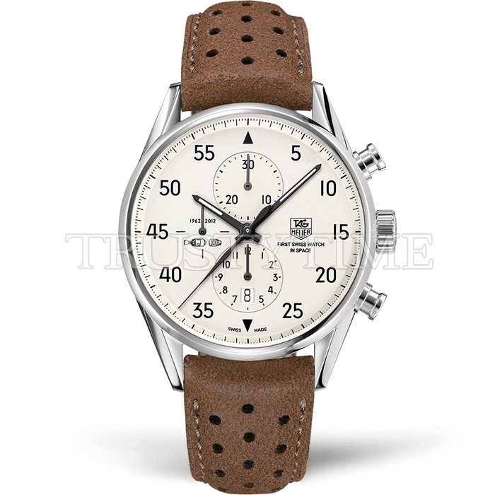 Часы Tag Heuer из коллекции Carrera Calibre 1887. Спортивные мужские часы Tag Heuer Carrera Calibre 1887 43mm CAR2015.FC6321 премиального качества (Артикул магазина: TG-0292) оснащены надежным автоматическим механизмом с автоподзаводом (работает от амплитуды движения руки) калибра Valjoux-7750, в котором реализованы следующие функции: часовая, минутная и секундная стрелки, а так же хронограф, дата. Круглый корпус часов стального цвета, имеющий размер 43 мм и высоту 16 мм превосходно дополнит образ и украсит запястье своего обладателя. Для изготовления часов Tag Heuer Carrera Calibre 1887 43mm CAR2015.FC6321 предлагаемых в нашем интернет-магазине, применяются нержавеющая сталь 316L высокого качества (Швейцарский стандарт), а так же сапфировое стекло высокой прочности, благодаря чему обеспечивается максимальная защита от сколов и механических повреждений. Отличительной чертой данной модели является белый циферблат, часовые индексы которого обеспечивают арабские цифры. Завершает образ кожаный ремешок коричневого цвета с фирменной раскладывающейся застежкой Tag Heuer. Водонепроницаемость данной модели составляет 30М (WR30) – допускается минимальное воздействие с водой.
