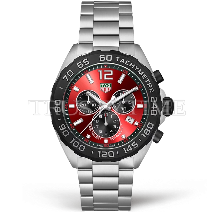 Часы Tag Heuer из коллекции Formula 1. Спортивные мужские часы Tag Heuer Formula 1 Chronograph Quartz 43mm CAZ101AN.BA0842 премиального качества (Артикул магазина: TG-0638) оснащены надежным кварцевым механизмом (работает от батареи) калибра Swiss Quartz ETA, в котором реализованы следующие функции: часовая, минутная и секундная стрелки, а так же хронограф, дата. Круглый корпус часов стального цвета, имеющий размер 43 мм и высоту 12.4 мм превосходно дополнит образ и украсит запястье своего обладателя. Для изготовления часов Tag Heuer Formula 1 Chronograph Quartz 43mm CAZ101AN.BA0842 предлагаемых в нашем интернет-магазине, применяются нержавеющая сталь 316L высокого качества (Швейцарский стандарт), а так же сапфировое стекло высокой прочности, благодаря чему обеспечивается максимальная защита от сколов и механических повреждений. Отличительной чертой данной модели является красный циферблат, часовые индексы которого обеспечивают часовые метки. Завершает образ браслет из нержавеющей стали стального цвета с фирменной раскладывающейся застежкой Tag Heuer. Водонепроницаемость данной модели составляет 30М (WR30) – допускается минимальное воздействие с водой.