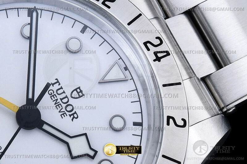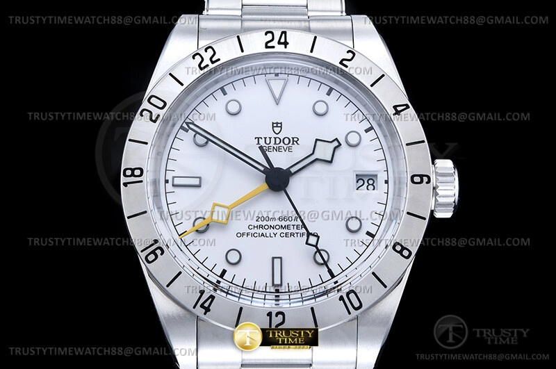 Часы Tudor из коллекции Black Bay GMT. Классические мужские часы Tudor Heritage Black Bay Pro GMT 39mm M79470-0004 премиального качества (Артикул магазина: TD-0861) оснащены надежным автоматическим механизмом с автоподзаводом (работает от амплитуды движения руки) калибра 3186, в котором реализованы следующие функции: часовая, минутная и секундная стрелки, а так же дата, двойное время (GMT). Круглый корпус часов стального цвета, имеющий размер 39 мм и высоту 15 мм превосходно дополнит образ и украсит запястье своего обладателя. Для изготовления часов Tudor Heritage Black Bay Pro GMT 39mm M79470-0004 предлагаемых в нашем интернет-магазине, применяются нержавеющая сталь 316L высокого качества (Швейцарский стандарт), а так же сапфировое стекло высокой прочности, благодаря чему обеспечивается максимальная защита от сколов и механических повреждений. Отличительной чертой данной модели является белый циферблат, часовые индексы которого обеспечивают часовые метки. Завершает образ браслет из нержавеющей стали стального цвета с фирменной раскладывающейся застежкой Tudor. Водонепроницаемость данной модели составляет 30М (WR30) – допускается минимальное воздействие с водой.