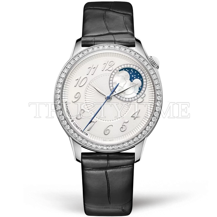 Часы Vacheron Constantin из коллекции Egerie. Классические женские часы Vacheron Constantin Egerie Moon Phase 37mm 8005F/120A-B497 премиального качества (Артикул магазина: VC-0410) оснащены надежным автоматическим механизмом с автоподзаводом (работает от амплитуды движения руки) калибра 1088, в котором реализованы следующие функции: часовая, минутная и секундная стрелки, а так же фаза луны. Круглый корпус часов стального цвета, имеющий размер 37 мм и высоту 12 мм превосходно дополнит образ и украсит запястье своего обладателя. Для изготовления часов Vacheron Constantin Egerie Moon Phase 37mm 8005F/120A-B497 предлагаемых в нашем интернет-магазине, применяются нержавеющая сталь 316F высокого качества (Швейцарский стандарт), а так же сапфировое стекло высокой прочности, благодаря чему обеспечивается максимальная защита от сколов и механических повреждений. Отличительной чертой данной модели является белый циферблат, часовые индексы которого обеспечивают арабские цифры. Завершает образ кожаный ремешок черного цвета с фирменной классической застежкой Vacheron Constantin. Водонепроницаемость данной модели составляет 30М (WR30) – допускается минимальное воздействие с водой.