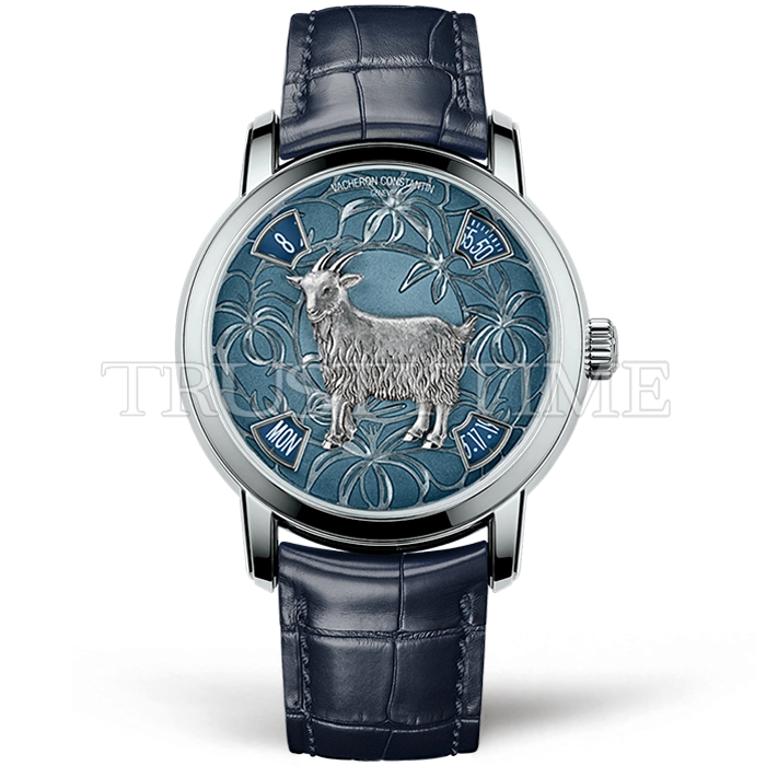 Часы Vacheron Constantin из коллекции Métiers d'Art. Классические мужские часы Vacheron Constantin Métiers d'Art The Legend of the Chinese Zodiac Year of the Goat 86073/000P-9890 премиального качества (Артикул магазина: VC-0349) оснащены надежным автоматическим механизмом с автоподзаводом (работает от амплитуды движения руки) калибра VC 2460SCC, в котором реализованы следующие функции: часова и минутка стрелки, а так же дата, день недели. Круглый корпус часов стального цвета, имеющий размер 40 мм и высоту 12.7 мм превосходно дополнит образ и украсит запястье своего обладателя. Для изготовления часов Vacheron Constantin Métiers d'Art The Legend of the Chinese Zodiac Year of the Goat 86073/000P-9890 предлагаемых в нашем интернет-магазине, применяются нержавеющая сталь 316F высокого качества (Швейцарский стандарт), а так же сапфировое стекло высокой прочности, благодаря чему обеспечивается максимальная защита от сколов и механических повреждений. Отличительной чертой данной модели является синий циферблат, часовые индексы которого обеспечивают арабские цифры. Завершает образ кожаный ремешок синего цвета с фирменной раскладывающейся застежкой Vacheron Constantin. Водонепроницаемость данной модели составляет 30М (WR30) – допускается минимальное воздействие с водой.