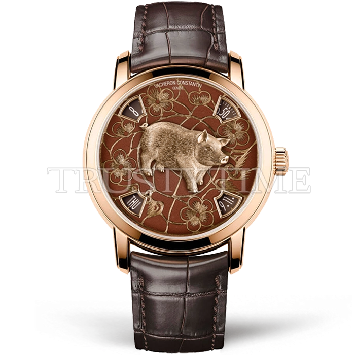 Часы Vacheron Constantin из коллекции Métiers d'Art. Классические мужские часы Vacheron Constantin Métiers d'Art The Legend of the Chinese Zodiac Year of the Pig 86073/000R-B428 премиального качества (Артикул магазина: VC-0358) оснащены надежным автоматическим механизмом с автоподзаводом (работает от амплитуды движения руки) калибра VC 2460SCC, в котором реализованы следующие функции: часова и минутка стрелки, а так же дата, день недели. Круглый корпус часов розового цвета, имеющий размер 40 мм и высоту 12.7 мм превосходно дополнит образ и украсит запястье своего обладателя. Для изготовления часов Vacheron Constantin Métiers d'Art The Legend of the Chinese Zodiac Year of the Pig 86073/000R-B428 предлагаемых в нашем интернет-магазине, применяются нержавеющая сталь 316F высокого качества (Швейцарский стандарт), а так же сапфировое стекло высокой прочности, благодаря чему обеспечивается максимальная защита от сколов и механических повреждений. Отличительной чертой данной модели является коричневый циферблат, часовые индексы которого обеспечивают арабские цифры. Завершает образ кожаный ремешок коричневого цвета с фирменной раскладывающейся застежкой Vacheron Constantin. Водонепроницаемость данной модели составляет 30М (WR30) – допускается минимальное воздействие с водой.