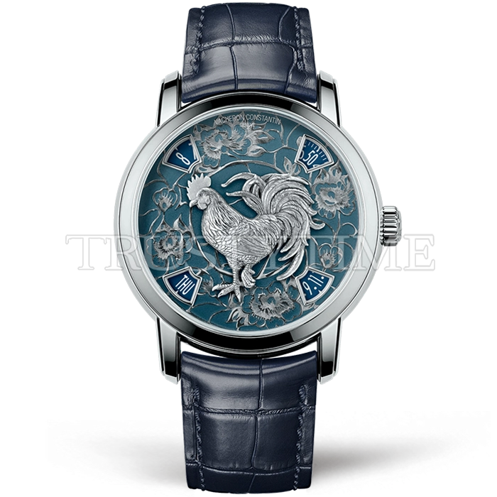 Часы Vacheron Constantin из коллекции Métiers d'Art. Классические мужские часы Vacheron Constantin Métiers d'Art The Legend of the Chinese Zodiac Year of the Rooster 86073/000P-B154 премиального качества (Артикул магазина: VC-0361) оснащены надежным автоматическим механизмом с автоподзаводом (работает от амплитуды движения руки) калибра VC 2460SCC, в котором реализованы следующие функции: часова и минутка стрелки, а так же дата, день недели. Круглый корпус часов стального цвета, имеющий размер 40 мм и высоту 12.7 мм превосходно дополнит образ и украсит запястье своего обладателя. Для изготовления часов Vacheron Constantin Métiers d'Art The Legend of the Chinese Zodiac Year of the Rooster 86073/000P-B154 предлагаемых в нашем интернет-магазине, применяются нержавеющая сталь 316F высокого качества (Швейцарский стандарт), а так же сапфировое стекло высокой прочности, благодаря чему обеспечивается максимальная защита от сколов и механических повреждений. Отличительной чертой данной модели является синий циферблат, часовые индексы которого обеспечивают арабские цифры. Завершает образ кожаный ремешок синего цвета с фирменной раскладывающейся застежкой Vacheron Constantin. Водонепроницаемость данной модели составляет 30М (WR30) – допускается минимальное воздействие с водой.