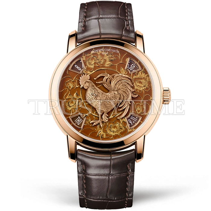 Часы Vacheron Constantin из коллекции Métiers d'Art. Классические мужские часы Vacheron Constantin Métiers d'Art The Legend of the Chinese Zodiac Year of the Rooster 86073/000R-B153 премиального качества (Артикул магазина: VC-0362) оснащены надежным автоматическим механизмом с автоподзаводом (работает от амплитуды движения руки) калибра VC 2460SCC, в котором реализованы следующие функции: часова и минутка стрелки, а так же дата, день недели. Круглый корпус часов розового цвета, имеющий размер 40 мм и высоту 12.7 мм превосходно дополнит образ и украсит запястье своего обладателя. Для изготовления часов Vacheron Constantin Métiers d'Art The Legend of the Chinese Zodiac Year of the Rooster 86073/000R-B153 предлагаемых в нашем интернет-магазине, применяются нержавеющая сталь 316F высокого качества (Швейцарский стандарт), а так же сапфировое стекло высокой прочности, благодаря чему обеспечивается максимальная защита от сколов и механических повреждений. Отличительной чертой данной модели является коричневый циферблат, часовые индексы которого обеспечивают арабские цифры. Завершает образ кожаный ремешок коричневого цвета с фирменной раскладывающейся застежкой Vacheron Constantin. Водонепроницаемость данной модели составляет 30М (WR30) – допускается минимальное воздействие с водой.