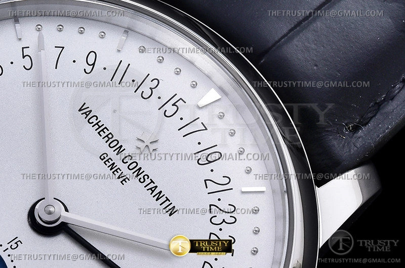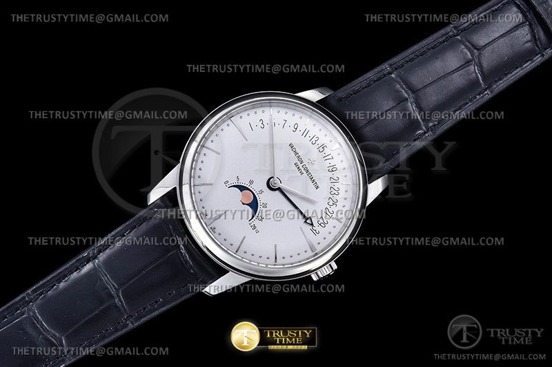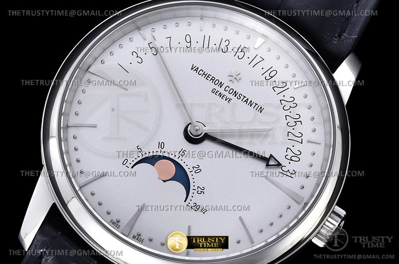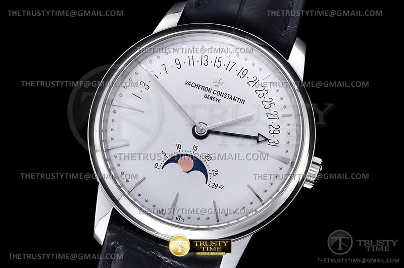 Часы Vacheron Constantin из коллекции Patrimony. Классические мужские часы Vacheron Constantin Patrimony Moonphase Retrograde Date 42mm 4010U/000R-B329 премиального качества (Артикул магазина: VC-0284) оснащены надежным автоматическим механизмом с автоподзаводом (работает от амплитуды движения руки) калибра 2460, в котором реализованы следующие функции: часова и минутка стрелки, а так же дата, фаза луны. Круглый корпус часов стального цвета, имеющий размер 42.5 мм и высоту 9.7 мм превосходно дополнит образ и украсит запястье своего обладателя. Для изготовления часов Vacheron Constantin Patrimony Moonphase Retrograde Date 42mm 4010U/000R-B329 предлагаемых в нашем интернет-магазине, применяются нержавеющая сталь 316L высокого качества (Швейцарский стандарт), а так же сапфировое стекло высокой прочности, благодаря чему обеспечивается максимальная защита от сколов и механических повреждений. Отличительной чертой данной модели является белый циферблат, часовые индексы которого обеспечивают часовые метки. Завершает образ кожаный ремешок черного цвета с фирменной раскладывающейся застежкой Vacheron Constantin. Водонепроницаемость данной модели составляет 30М (WR30) – допускается минимальное воздействие с водой.