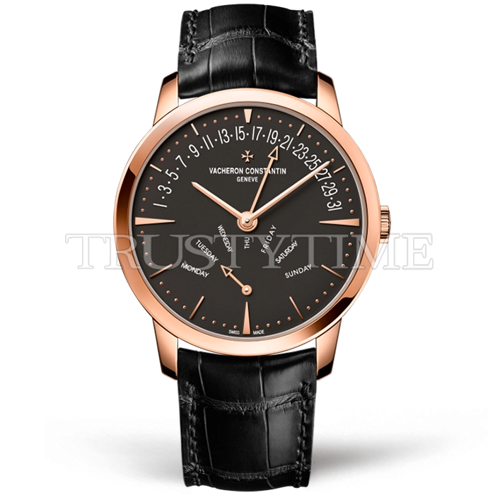 Часы Vacheron Constantin из коллекции Patrimony. Классические мужские часы Vacheron Constantin Patrimony Retrograde Day-Date 42mm 4000U/000R-B111 премиального качества (Артикул магазина: VC-0380) оснащены надежным автоматическим механизмом с автоподзаводом (работает от амплитуды движения руки) калибра 2460, в котором реализованы следующие функции: часова и минутка стрелки, а так же дата, день недели. Круглый корпус часов розового цвета, имеющий размер 42.5 мм и высоту 9.7 мм превосходно дополнит образ и украсит запястье своего обладателя. Для изготовления часов Vacheron Constantin Patrimony Retrograde Day-Date 42mm 4000U/000R-B111 предлагаемых в нашем интернет-магазине, применяются нержавеющая сталь 316L высокого качества (Швейцарский стандарт), а так же сапфировое стекло высокой прочности, благодаря чему обеспечивается максимальная защита от сколов и механических повреждений. Отличительной чертой данной модели является черный циферблат, часовые индексы которого обеспечивают часовые метки. Завершает образ кожаный ремешок черного цвета с фирменной раскладывающейся застежкой Vacheron Constantin. Водонепроницаемость данной модели составляет 30М (WR30) – допускается минимальное воздействие с водой.