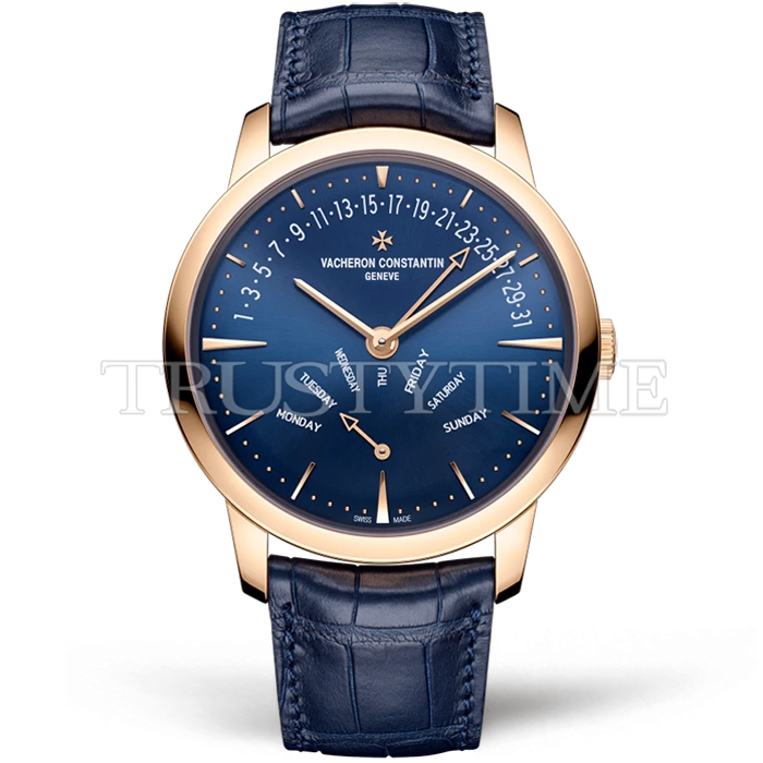 Часы Vacheron Constantin из коллекции Patrimony. Классические мужские часы Vacheron Constantin Patrimony Retrograde Day-Date 42mm 4000U/000R-B516 премиального качества (Артикул магазина: VC-0381) оснащены надежным автоматическим механизмом с автоподзаводом (работает от амплитуды движения руки) калибра 2460, в котором реализованы следующие функции: часова и минутка стрелки, а так же дата, день недели. Круглый корпус часов розового цвета, имеющий размер 42.5 мм и высоту 9.7 мм превосходно дополнит образ и украсит запястье своего обладателя. Для изготовления часов Vacheron Constantin Patrimony Retrograde Day-Date 42mm 4000U/000R-B516 предлагаемых в нашем интернет-магазине, применяются нержавеющая сталь 316L высокого качества (Швейцарский стандарт), а так же сапфировое стекло высокой прочности, благодаря чему обеспечивается максимальная защита от сколов и механических повреждений. Отличительной чертой данной модели является синий циферблат, часовые индексы которого обеспечивают часовые метки. Завершает образ кожаный ремешок синего цвета с фирменной раскладывающейся застежкой Vacheron Constantin. Водонепроницаемость данной модели составляет 30М (WR30) – допускается минимальное воздействие с водой.
