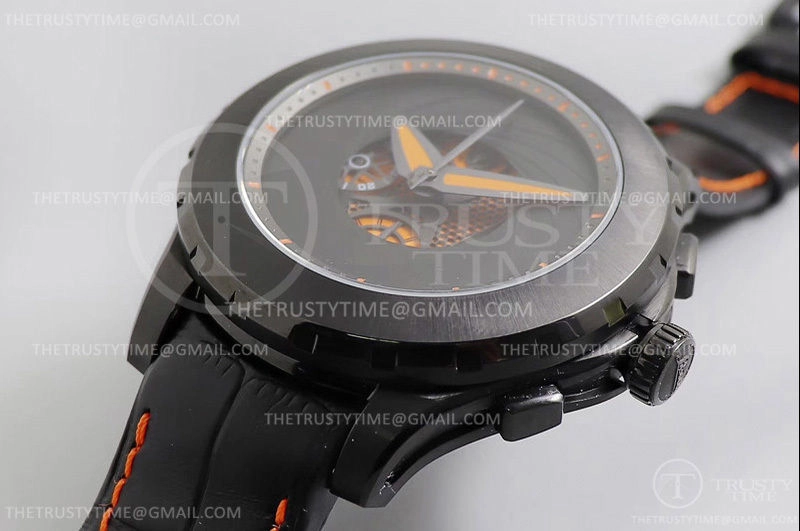 Часы Valbray из коллекции Oculus. Спортивные мужские часы Valbray Oculus Chrono Hypnosis Orange VR01M премиального качества (Артикул магазина: VB-0013) оснащены надежным автоматическим механизмом с автоподзаводом (работает от амплитуды движения руки) калибра Valjoux-7750, в котором реализованы следующие функции: часовая, минутная и секундная стрелки, а так же хронограф, дата. Круглый корпус часов черного цвета, имеющий размер 46 мм и высоту 16.5 мм превосходно дополнит образ и украсит запястье своего обладателя. Для изготовления часов Valbray Oculus Chrono Hypnosis Orange VR01M предлагаемых в нашем интернет-магазине, применяются нержавеющая сталь 316L высокого качества (Швейцарский стандарт), а так же сапфировое стекло высокой прочности, благодаря чему обеспечивается максимальная защита от сколов и механических повреждений. Отличительной чертой данной модели является оранжевый циферблат, без меток и цифр. Завершает образ кожаный ремешок черного цвета с фирменной классической застежкой Valbray. Водонепроницаемость данной модели составляет 30М (WR30) – допускается минимальное воздействие с водой.