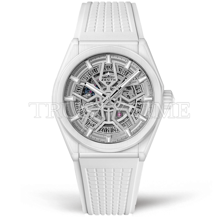 Часы Zenith из коллекции Defy. Классические мужские часы Zenith Defy Classic 41mm 49.9002.670/01.R792 премиального качества (Артикул магазина: ZN-0324) оснащены надежным автоматическим механизмом с автоподзаводом (работает от амплитуды движения руки) калибра 670, в котором реализованы следующие функции: часовая, минутная и секундная стрелки, а так же дата. Круглый корпус часов белого цвета, имеющий размер 41 мм и высоту 10.8 мм превосходно дополнит образ и украсит запястье своего обладателя. Для изготовления часов Zenith Defy Classic 41mm 49.9002.670/01.R792 предлагаемых в нашем интернет-магазине, применяются керамика высокого качества (Швейцарский стандарт), а так же сапфировое стекло высокой прочности, благодаря чему обеспечивается максимальная защита от сколов и механических повреждений. Отличительной чертой данной модели является скелетонизированный циферблат, часовые индексы которого обеспечивают часовые метки. Завершает образ каучуковый ремешок белого цвета с фирменной раскладывающейся застежкой Zenith. Водонепроницаемость данной модели составляет 30М (WR30) – допускается минимальное воздействие с водой.